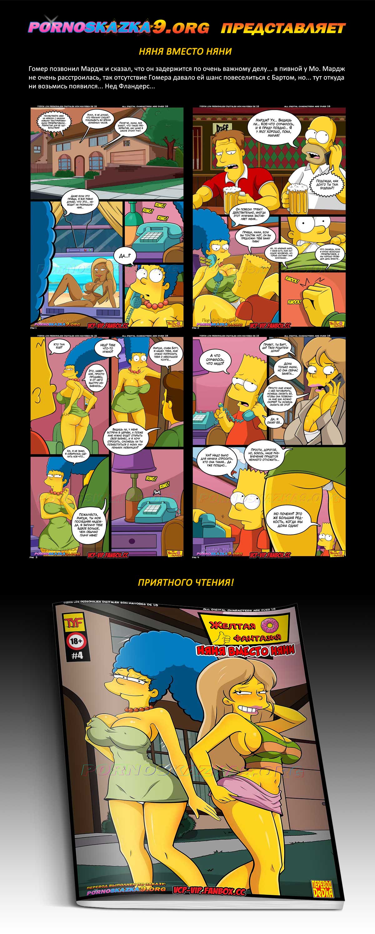 Порно комикс «Няня вместо няни.» Гомер позвонил Мардж и сказал, что он задержится по очень важному делу… в пивной у Мо. Мардж не очень расстроилась, так отсутствие Гомера давало ей шанс повеселиться с Бартом, но… тут откуда ни возьмись появился… Нед Фландерс…